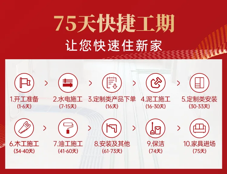 【快捷工期】僅需75天的快捷工期,東家樂定制服務親力親為,從量尺到瓷磚鋪貼后的高度確定,均在開工三日內完成,拒絕外包,確保精準。開工一周后,定制柜子即刻下單生產,瓷磚完工即安裝,為客戶寶貴時間減負45天。過程200多個施工節點,層層把關,有效提升施工效率,確保工程品質快速的完美落地!讓工地開口說話,讓工地形成口碑!